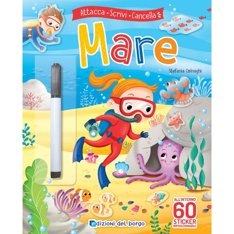 Una novità dedicata all’affascinante mondo del mare, ricca di giochi e attività, 60 sticker riposizionabili per creare i propri scenari e un vocabolario figurato per l’arricchimento lessicale. Le attività sono ripetibili grazie alle pagine riscrivibili e al pennarello a inchiostro cancellabile.