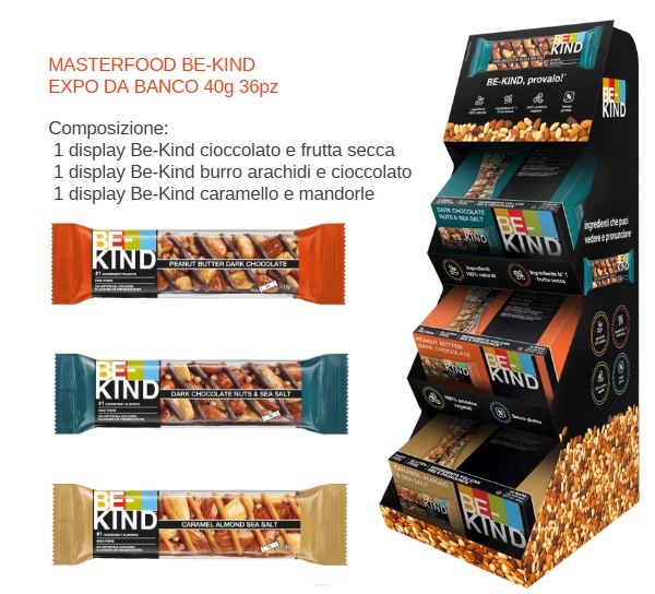 Ingredienti: Mandorle, arachidi, ricopertura di cioccolato fondente (zucchero, pasta di cacao, burro di cacao, emulsionante (lecitina di soia), aroma naturale), fibra di radice di cicoria, miele, sciroppo di glucosio, patatine di riso (farina di riso), pasta di cacao, sale marino, emulsionante (lecitina di soia). (Può contenere: altra frutta a guscio, latte).