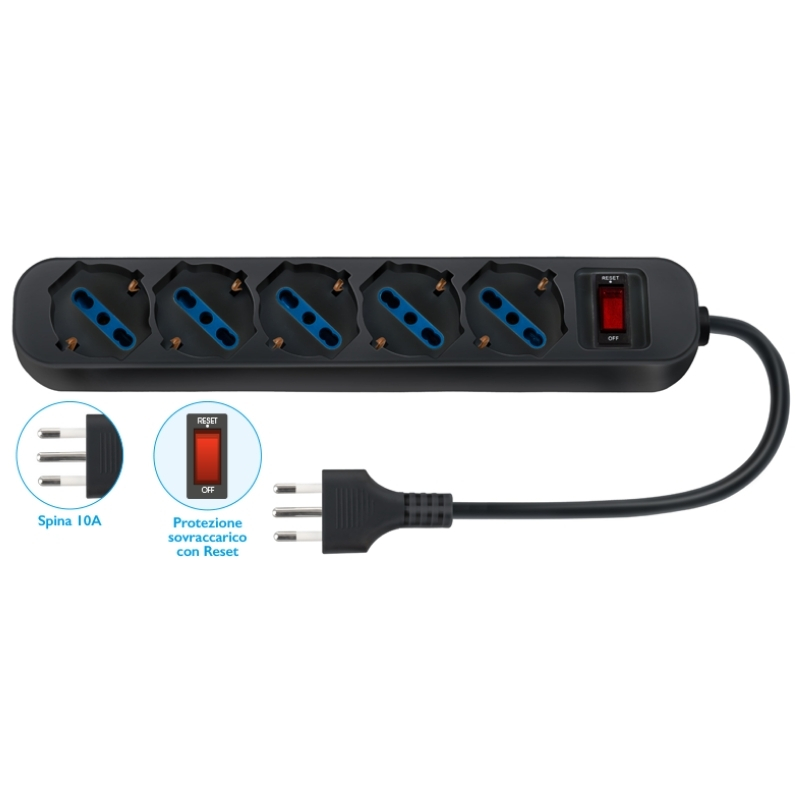 Multipresa con Interrut. di Protez. – 5 Schuko – Spina 10 A – Nero.