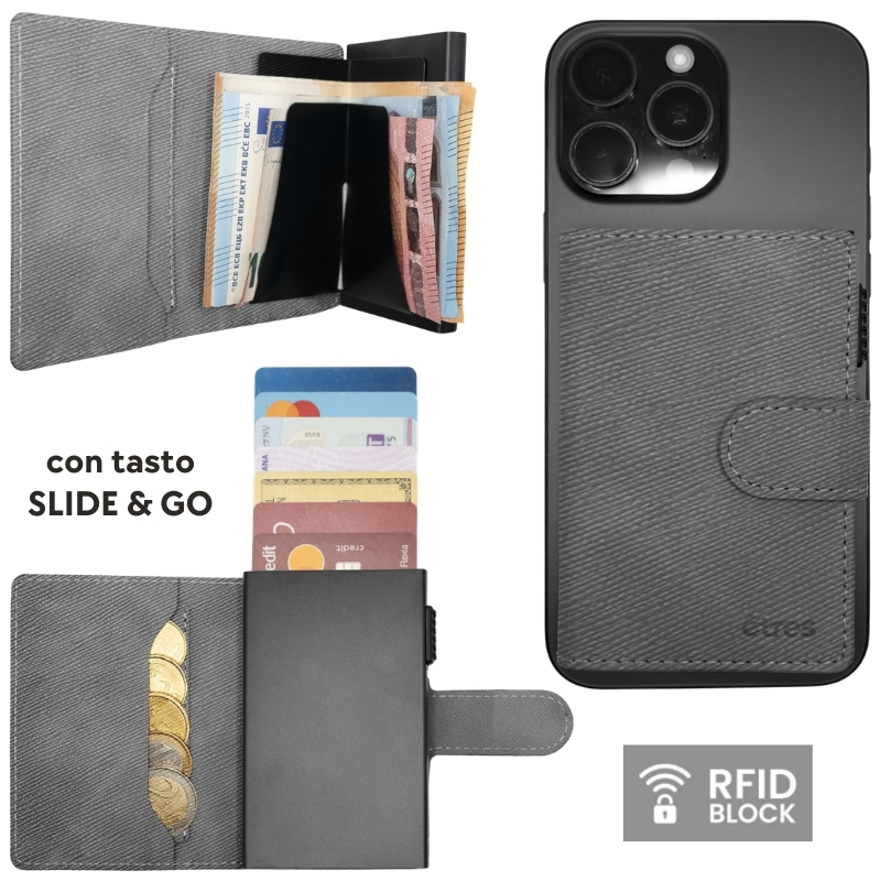 Etres Smart Wallet Slide Portacarte in Metallo Saffiano Grey Magsafe.