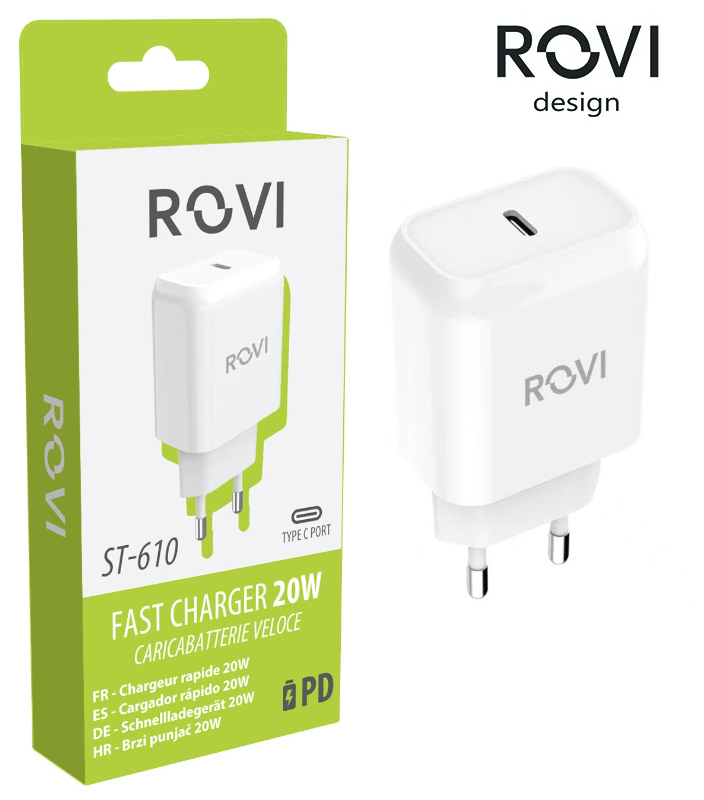 Rovi Fast charger 1 porta Type-C, 20W, dotato di tecnologia PD che permette un carica veloce, sicura e stabile.