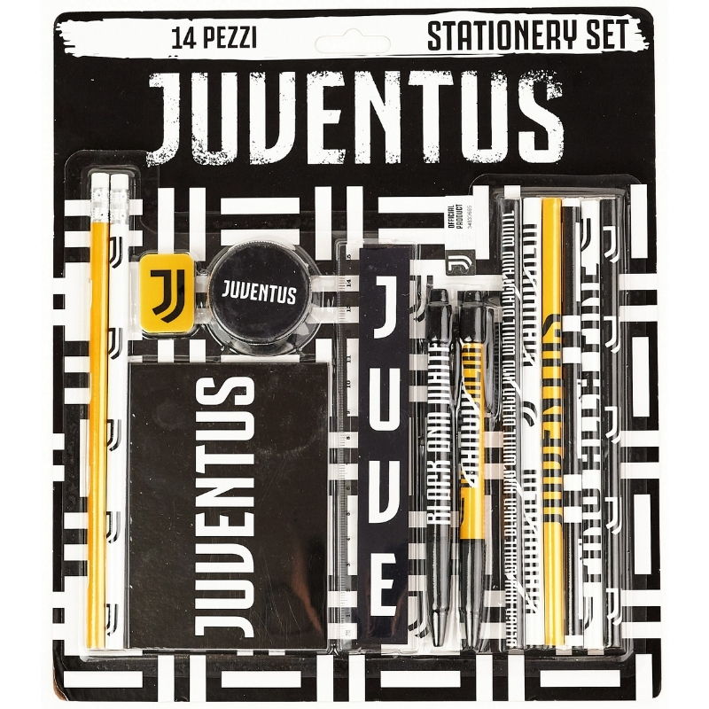Set Cancelleria - Juventus - 14 Pezzi (2 matite, 2 penne, 1 righello, 1 temperino, 1 block notes, 6 matite colorate, 1 gomma).