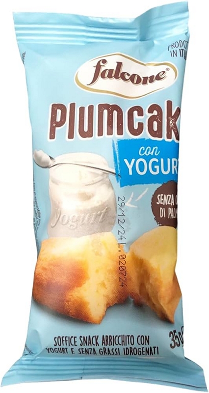 Ingredienti: Farina di GRANO tenero tipo “0”, zucchero semolato, UOVA pastorizzate, olio di semi di girasole, yogurt intero 3%(LATTE),  sciroppo di glucosio, agenti lievitanti(difosfato disodico, carbonato acido di sodio, amido di FRUMENTO, sciroppo di sorbitolo, proteine del LATTE, emulsionanti(mono e digliceridi degli acidi grassi), aromi, sale.