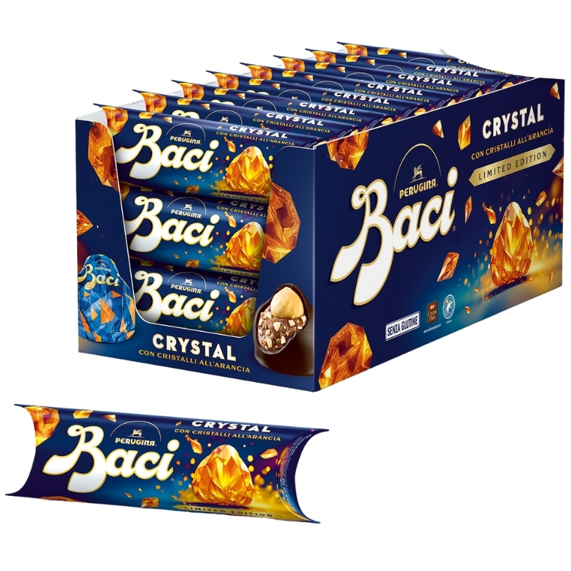 Baci® Perugina® Crystal è la nuova Limited Edition che unisce il cioccolato fondente alle vivaci note agrumate dell’arancia. La ricetta combina croccanti cristalli all’arancia al pregiato cioccolato Fondente Luisa® al gusto di arancia, per un’armonia di sapori eleganti e sorprendenti, che conquistano al primo assaggio.