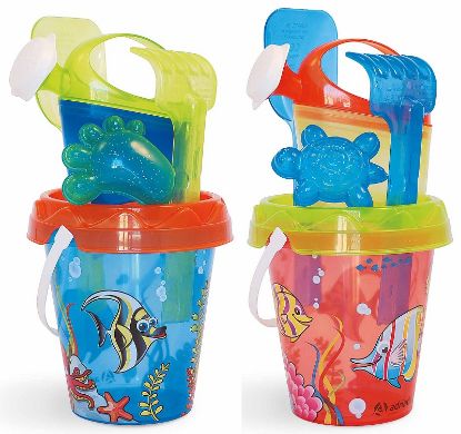 Secchiello per giocare con la sabbia e l’acqua. Set completo di 8 pezzi: secchiello, paletta, rastrello, passasabbia, innaffiatoio e formine assortite. Giocattolo realizzato in plastica 100% riciclabile, atossica, resistente al sole e all’acqua. Dimensioni: 47 cm Diametro secchiello: 26 cm