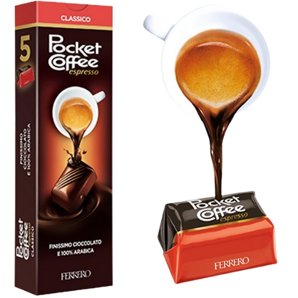 Quando c'è bisogno di una ricarica di piacere, POCKET COFFEE è al tuo fianco. Un guscio di finissimo cioccolato racchiude una miscela unica di caffè 100% arabica, accuratamente selezionata tra le migliori varietà del mondo provenienti da Brasile, Costa Rica, S. Domingo e Colombia.
