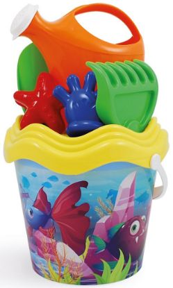 Secchiello per giocare con la sabbia e l’acqua. Set completo di 8 pezzi: secchiello, paletta, rastrello, passasabbia, innaffiatoio e formine assortite. Giocattolo realizzato in plastica 100% riciclabile, atossica, resistente al sole e all’acqua. Dimensioni: 47 cm Diametro secchiello: 26 cm