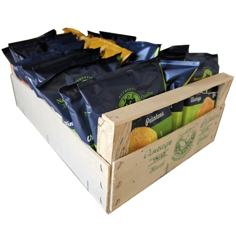 Porta il fascino vintage e l'ecologia sulla tua tavola con l'esclusiva Cassetta Mista, un tesoro che racchiude 24 pacchetti da 40/25 grammi delle patatine più straordinarie e 25 gr nel formato vegan. Questa cassetta in legno trasmette un'atmosfera retrò e autentica, offrendo al tempo stesso un impegno ecologico per un futuro sostenibile.