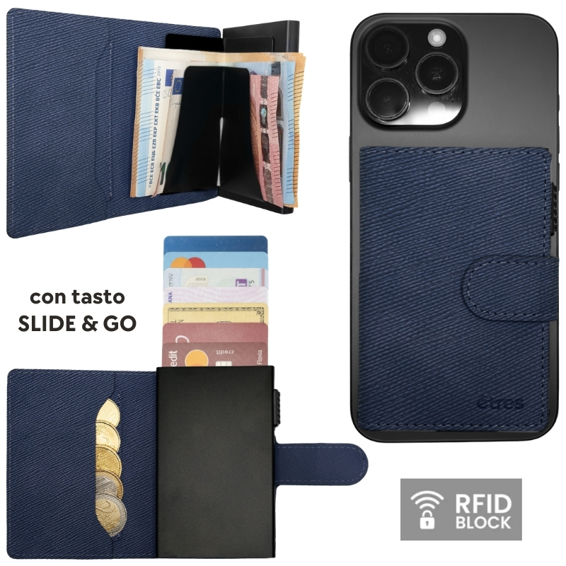 Etres Smart Wallet Slide Portacarte in Metallo Saffiano Dark Blue Magsafe.