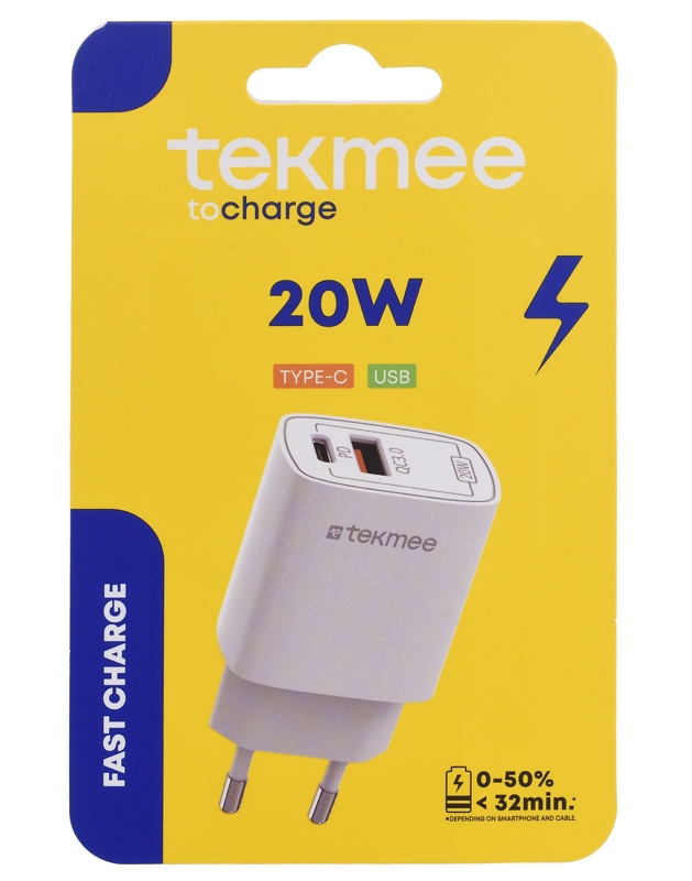 Presa alimentazione da muro usb+type-c 2 20w 1pz bianco fast charge tekmee - 41430189