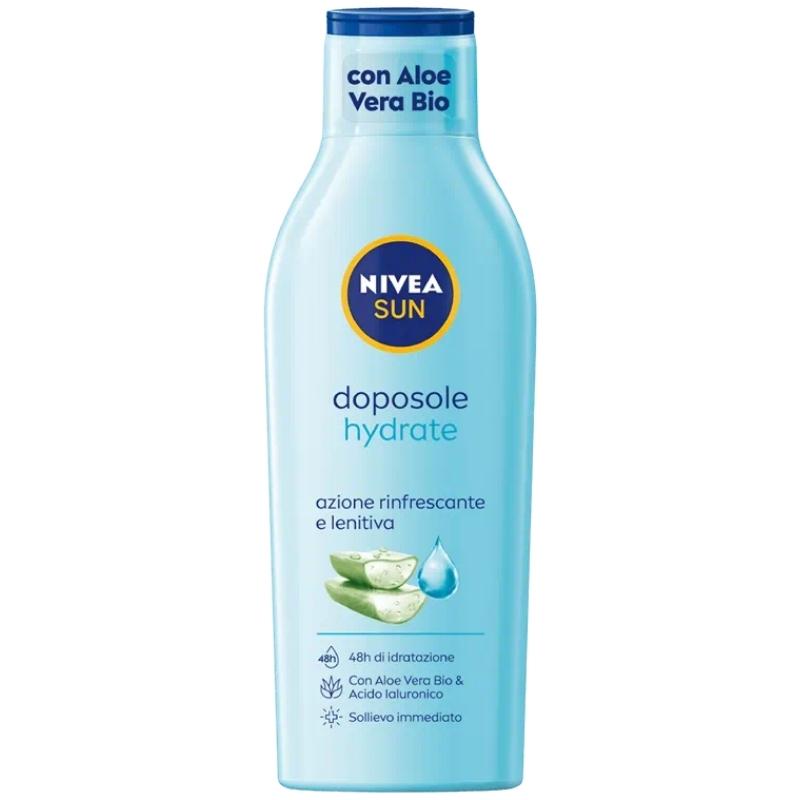 NIVEA SUN Doposole Hydrate rinfresca la pelle e la idrata per 48 ore. La formula leggera con Aloe Vera Bio e Acido Ialuronico lenisce, rinfresca e aiuta la pelle a riparare la perdita di idratazione, per un'abbronzatura bella e duratura. L’applicazione regolare dopo l’esposizione al sole aumenta il livello di idratazione della pelle, lasciandola morbida e liscia come la seta e prevenendo le spellature. La sua formula leggera non unge la pelle e si assorbe facilmente.